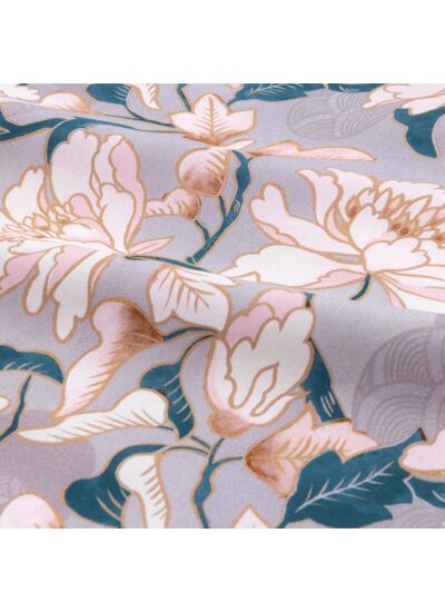 La collection K Mitsuko s'inspire d'une ancienne archive japonaise, mettant en avant la pivoine, fleur emblématique chez Kenzo. Dans cette œuvre, la pivoine se révèle à travers une palette de couleurs, où des nuances givrées se mêlent à des éclats de vert canard. Un motif japonais traditionnel, évoquant la finesse de la dentelle, enrichit discrètement l'arrière-plan.