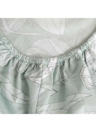 Respirez le parfum suave de ces fleurs généreuses et chatoyantes. Imprimée, la composition florale se révèle à la lumière de notre craquante percale de coton adoucie d'un vert tendre, végétal à souhait. Au verso, Ylang sonne comme un doux prétexte pour dialoguer avec nos unis.