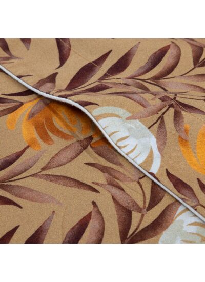 Des fleurs rayonnent, leurs pétales scintillent, et des feuilles se joignent à la fête. Les teintes sont lumineuses mais doucement patinées par le tissage de son satin lavé. Au dos, un imprimé Cumin, quadrillé de lignes blanches, pour un effet lin très mode.