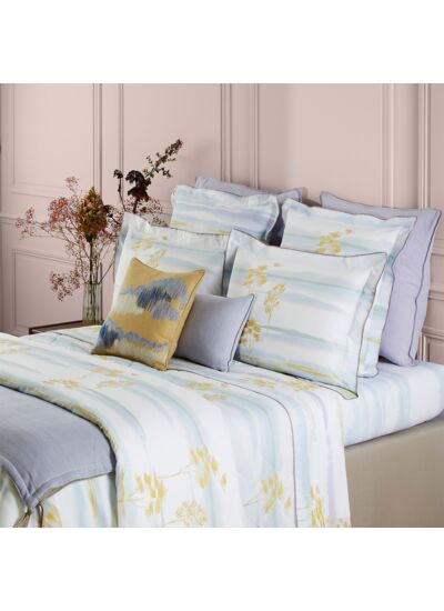 Horizons évoque des paysages évanescents, où se mêlent vapeurs, encres diluées et dégradés pastel sur une batiste de coton d'une finesse incomparable. Dormir dans cette matière, c'est goûter à une sensation unique de légèreté et de douceur.