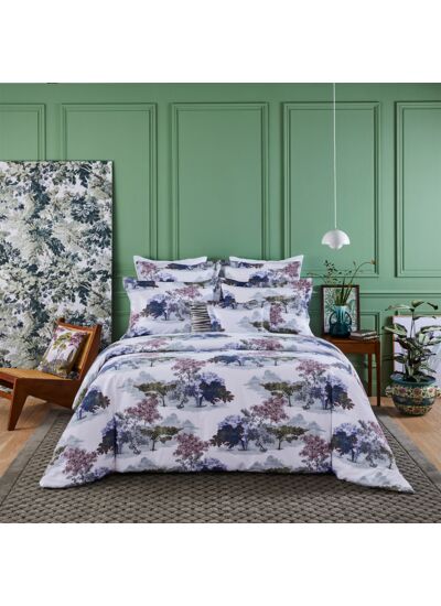 Tel une toile de Jouy, des motifs de chêne vert, de pin parasol et de sombre noyer sont délicatement dessinés à la plume puis imprimés sur un tissu en batiste de coton biologique. Ce modèle incarne l'élégance contemporaine avec ses nuances raffinées inspirées de la nature.