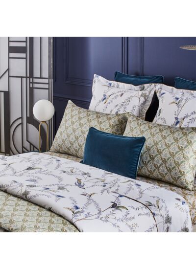 Ce modèle est un hommage à la Salle des Feuillages du Palazzo Grimani di Santa Maria Formosa à Venise. En célébration de la somptueuse nature, le plafond de la salle est entièrement recouvert de plantes, d'arbres fruitiers et de fleurs, dans un fourré dense habité de nombreux animaux. Le motif de Grimani propose un ramage onirique d'oiseaux et de motifs entre feuillages et cachemire, en nuances délicates de bleu-gris et mordorées.
