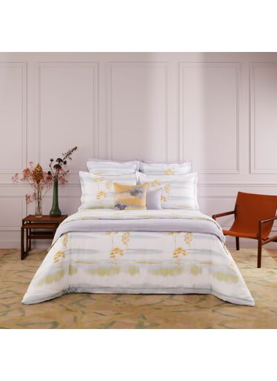 Horizons évoque des paysages évanescents, où se mêlent vapeurs, encres diluées et dégradés pastel sur une batiste de coton d'une finesse incomparable. Dormir dans cette matière, c'est goûter à une sensation unique de légèreté et de douceur.