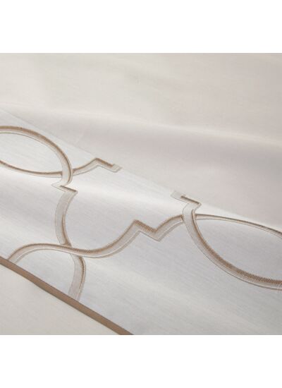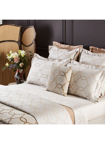 Palazzo, le jacquard luxueux de la saison, est un motif d'entrelacs à la géométrie souple évoquant l'ornement architectural. La technique spécifique au tissage jacquard crée une lumière sophistiquée entre noisette et perle, pour une déco très "master bedroom," sobre et élégante.