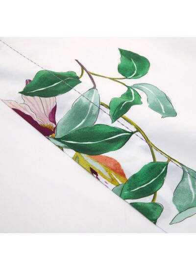 Une expérience sensorielle vous emmène au cœur de luxuriantes fleurs estivales qui embaument les jardins. Un motif évoquant une palette de couleurs, où une flore exceptionnelle et un feuillage vert menthe se fondent harmonieusement sur un fond de satin blanc. Cette composition offre un regard intime et distinctif sur la fleur, une thématique chère à la maison Yves Delorme.