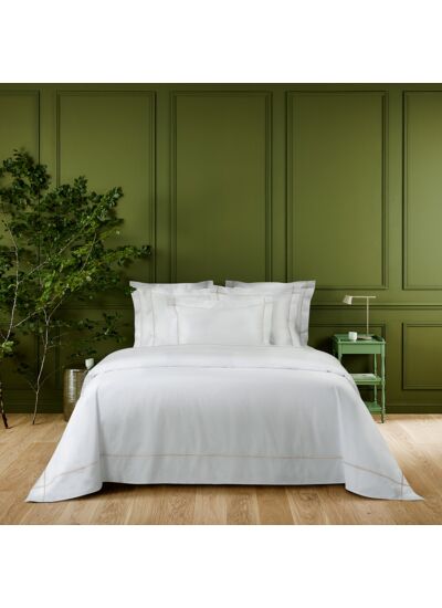 Athéna, la déesse de l'artisanat et du tissage, incarne l'élégance du blanc. Sa fraîcheur, sa résistance, sa finesse et son aspect mat garantissent une qualité haut de gamme. La pureté graphique d'un bourdon droit de couleur encadre délicatement les taies d'oreiller à volants dans un geste élégant de lignes entrecroisées.
