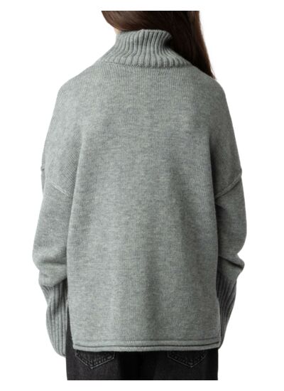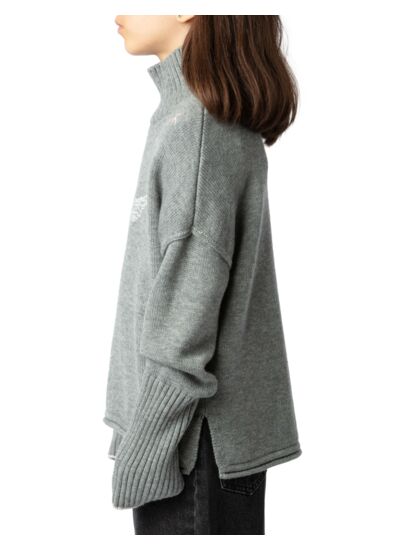 Composé à 65% laine et 35% polyamide, ce pull en maille grise est conçu pour durer tout en restant doux au toucher. Les finitions incluent un col montant, des manches longues avec trous pour les pouces, des bords côtelés et la signature ZV pointelle qui témoigne de l’authenticité de la marque Zadig&Voltaire.