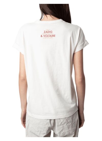 100 % coton pour une douceur naturelle et une durabilité optimale. Col rond, manches courtes, imprimé photoprint à l’avant, signature Zadig&Voltaire au dos. Fabriqué au Portugal.