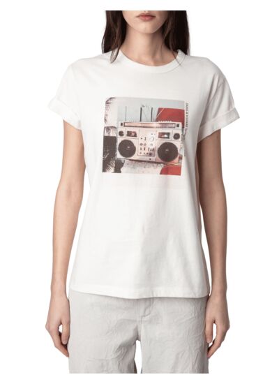 Confectionné en coton blanc, ce T-shirt féminin se distingue par son imprimé photoprint Ghetto Blaster à l’avant, symbole d’une énergie urbaine et rétro assumée. La signature Zadig&Voltaire au dos apporte une touche de sophistication discrète, tandis que le col rond et les manches courtes garantissent une silhouette moderne et décontractée. Fabriqué au Portugal, ce modèle reflète un savoir-faire européen reconnu.