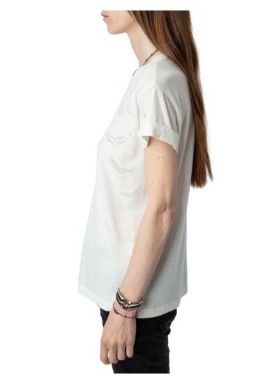 Composition 100% polyester, jersey doux et léger. Coupe large, col rond, manches courtes à revers. Détails strass sur les ailes latérales. Marque Zadig&Voltaire.