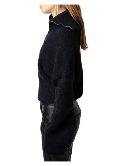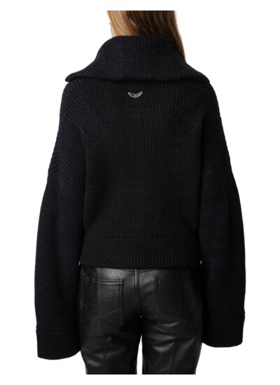 Tricoté en laine mérinos et cachemire noir, fermeture zippée, col montant marin, manches longues évasées, bords côtelés, signature ailes en métal au dos.