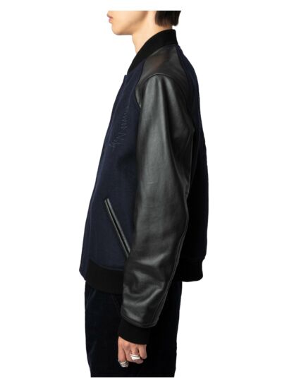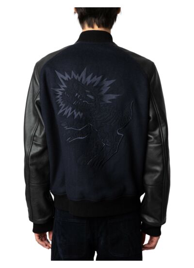 Blouson bomber bimatière en laine marine encre pour homme. Empiècements épaules et manches en cuir grainé noir. Broderies badge XO Skull, "Voltaire" et "Art Is Truth" à l’avant, dinosaure au dos. Col côtelé, fermeture à boutons pression. Deux poches doubles passepoilées en cuir, deux poches intérieures. Manches longues, bords côtelés chevrons. Doublure intérieure. Composition principale : laine. Marque : Zadig&Voltaire.