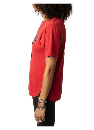 Affichez un style audacieux et authentique avec ce T-shirt en coton biologique au rouge Crimson intense. Son effet vintage délavé et le flock "Voltaire 25" orné de contours strassés apportent une touche rock et raffinée à votre garde-robe.
