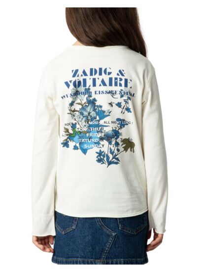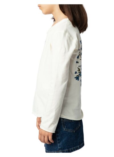 100% coton biologique, jersey léger et respirant. Col tunisien avec boutons, manches longues, bords bruts. Signature ZV imprimée à l’avant et au dos, broderie discrète sur la manche. Disponible en écru Lait fille. Marque : Zadig&Voltaire.