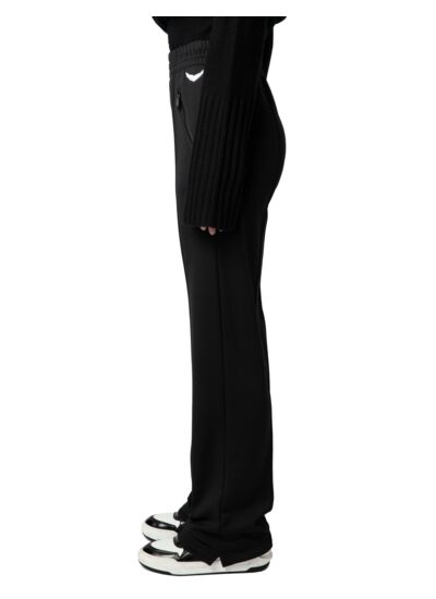 Ce pantalon de jogging droit large noir pour femme se distingue par sa coupe fluide et ses détails soignés. La broderie signature ailes à l’avant apporte une touche d’originalité subtile, tandis que les plis sur la longueur et les petites fentes au bas soulignent une silhouette élégante et moderne. Conçu pour s’adapter à toutes vos envies, il combine aisance et raffinement sans compromis.
