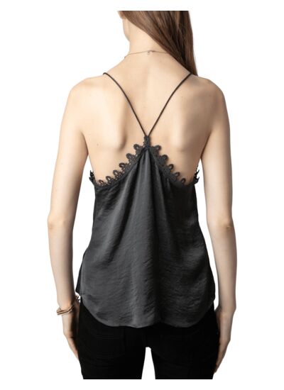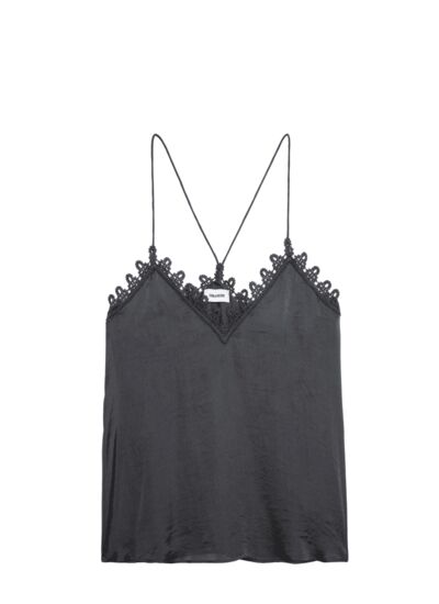 Confectionné dans un satin fluide, ce caraco esprit lingerie épouse délicatement la silhouette. Son décolleté plongeant souligne le port de tête tandis que les bords en dentelle apportent une touche raffinée et délicate. Les fines bretelles non réglables assurent un maintien léger et une esthétique épurée, idéale pour un look à la fois sophistiqué et naturel.