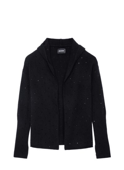 Composition 100% cachemire. Cardigan noir avec strass. Capuche intégrée. Manches longues avec trous pour les pouces. Bords côtelés pour une finition soignée. Marque : Zadig&Voltaire.