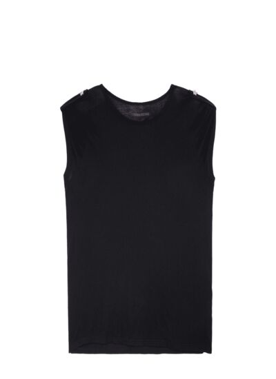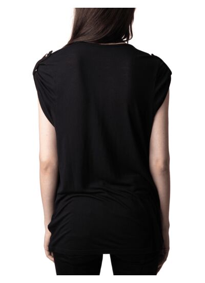 Confectionné en viscose douce, ce modèle signé Zadig&Voltaire allie confort et esthétique. Les manches courtes et les pattes d’épaules ornées de boutons bijoux offrent une silhouette structurée et féminine, parfaite pour passer du bureau à une sortie en soirée sans effort.