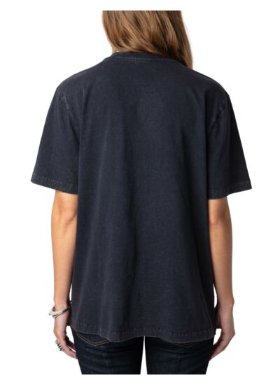100 % coton biologique. Col rond. Manches courtes. Bords côtelés. Imprimé patch en feutre "Mon Amour" effet acide usé à fils lâchés. Couleur bleu Encre. Marque Zadig&Voltaire.
