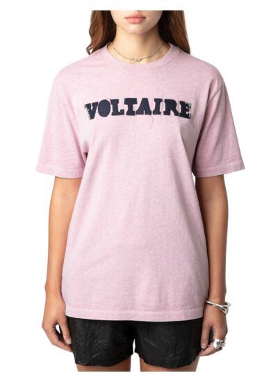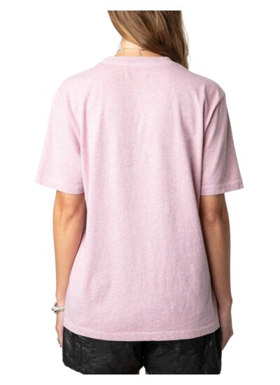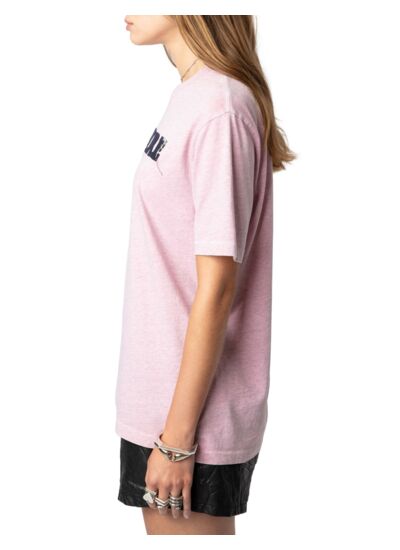 100% coton biologique. Col rond. Manches courtes avec bords côtelés. Imprimé patch en feutre "Voltaire" effet usé à fils lâchés. Couleur : Cameo Pink. Marque : Zadig&Voltaire.