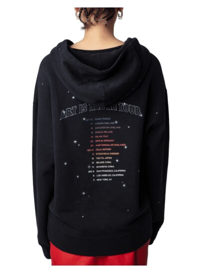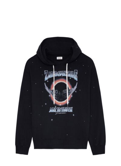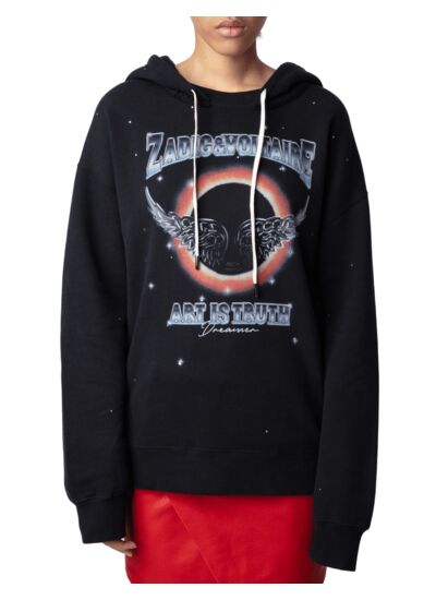 Conçu pour allier confort et élégance, ce hoodie noir épouse parfaitement la silhouette féminine grâce à ses manches longues et ses bords côtelés. Le cordon de serrage à la capuche permet un ajustement personnalisé, tandis que le design signé Zadig&Voltaire apporte une touche rock-chic unique, fabriquée avec soin au Portugal.