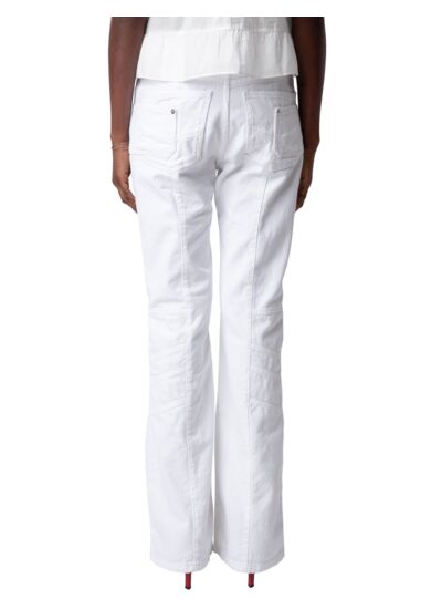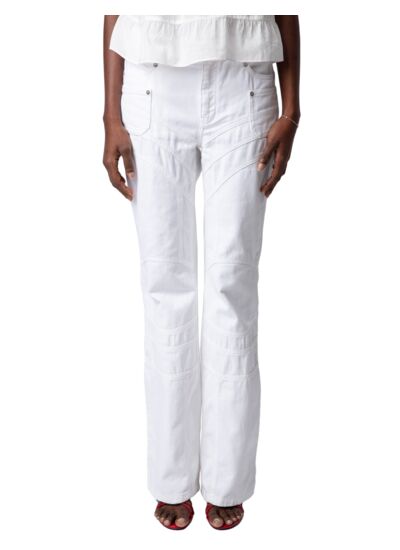 Jean en denim blanc 100 % coton, coupe ample Judo. Fermeture zippée et boutonnée, passants pour ceinture à la taille. 5 poches avec empiècements. Jacron cuir “Zadig Denim” au dos. Détails surpiqués pour une finition soignée.
