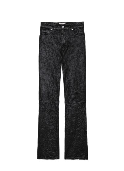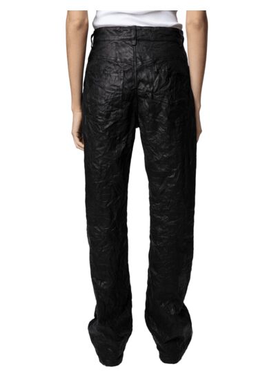 Confectionné dans un cuir noir froissé emblématique de Zadig&Voltaire, ce pantalon se distingue par son aspect unique obtenu grâce à un procédé exclusif. Les poches à rabat sur le devant et les poches plaquées au dos ajoutent une touche fonctionnelle et esthétique, renforçant son allure contemporaine. La fermeture zippée et le bouton assurent un maintien parfait tout au long de la journée.