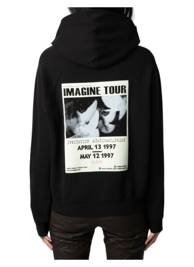 Confectionné en molleton noir, ce sweatshirt large séduit par ses imprimés signature ailes à l’avant et un photoprint Concert orné de strass au dos, qui captent le regard sans en faire trop. La capuche et la poche avant renforcent son côté pratique tandis que les manches longues raglan et les bords côtelés assurent une coupe décontractée et facile à porter au quotidien.