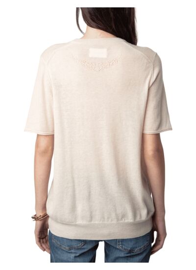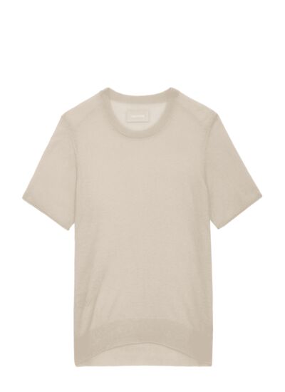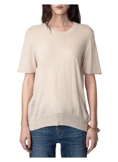 100% cachemire plume. Col rond. Manches courtes. Motifs ailes ajourées au dos. Bords côtelés et signature ZV pointelle. Couleur beige. Marque Zadig&Voltaire.
