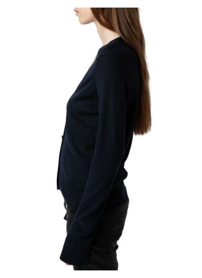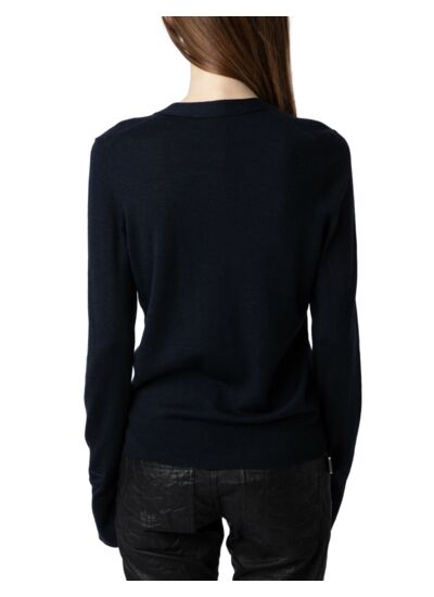 100% laine mérinos fine bleu marine. Boutons décoratifs en forme de cœurs, étoiles et ronds avec strass. Décolleté en V. Manches longues avec poignets fendus et côtelés. Broderie ailes au dos. Marque : Zadig&Voltaire.