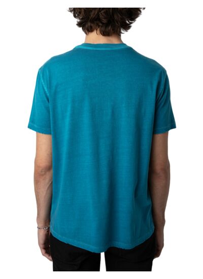 100 % coton biologique pour une douceur naturelle et une meilleure résistance. Col rond, manches courtes, bords usés pour un effet vintage maîtrisé. Disponible en bleu Curacao, ce T-shirt est signé Zadig&Voltaire, gage d’un savoir-faire reconnu.