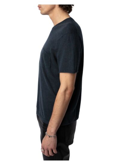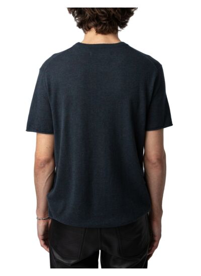 100% cachemire plume, col rond, manches courtes, bords roulottés, poche poitrine plaquée. Coloris gris Nightmare. Marque Zadig&Voltaire.