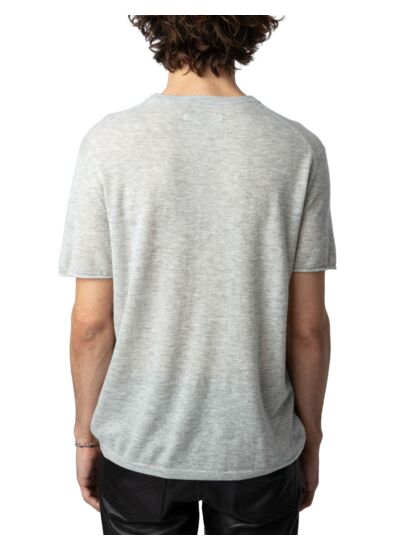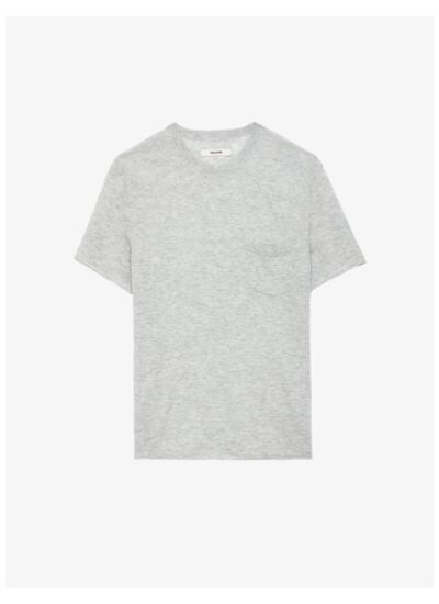 100 % cachemire plume, gris chiné clair, col rond, manches courtes, bords roulottés, poche poitrine plaquée. Marque : Zadig&Voltaire.