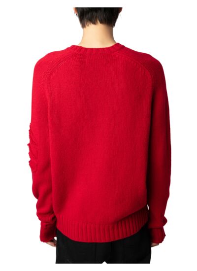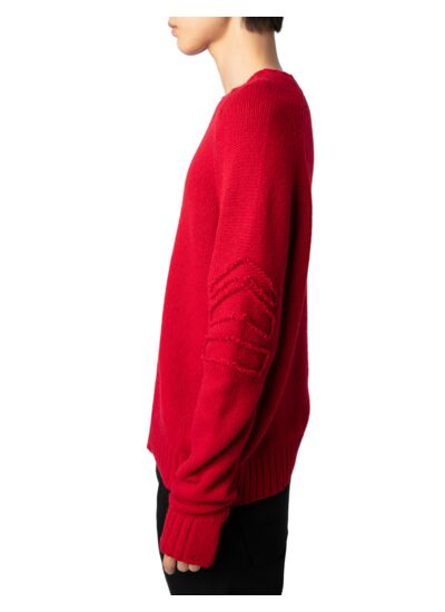 100% laine mérinos. Col rond. Manches longues avec emmanchures marteaux. Bords côtelés aux poignets et à la base. Flèches en relief sur le bras gauche. Signature ZV en relief. Couleur rouge Cerise. Marque Zadig&Voltaire.