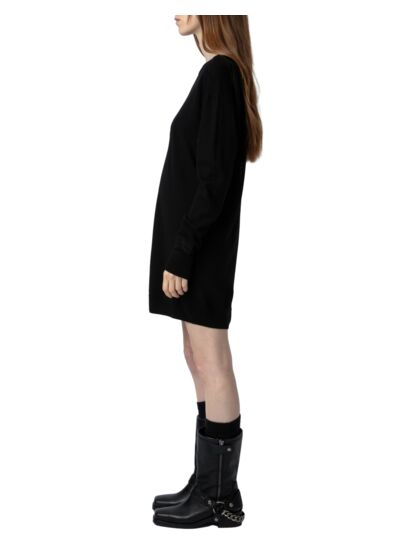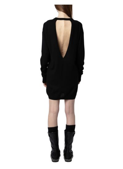 100% laine mérinos fine, col rond, décolleté en V plongeant au dos, manches longues, bords côtelés, broderie ailes ton sur ton sur le poignet gauche. Couleur noire. Marque Zadig&Voltaire.