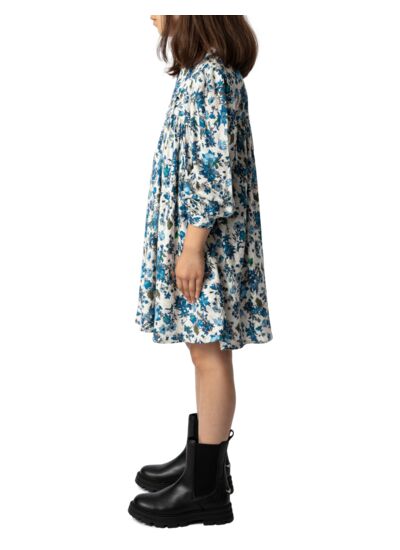 Robe courte multicolore à imprimé fleuri, col rond, manches longues, fermeture zippée au dos, jupe évasée avec détails plissés à l’avant. Composition : viscose. Marque : Zadig&Voltaire.