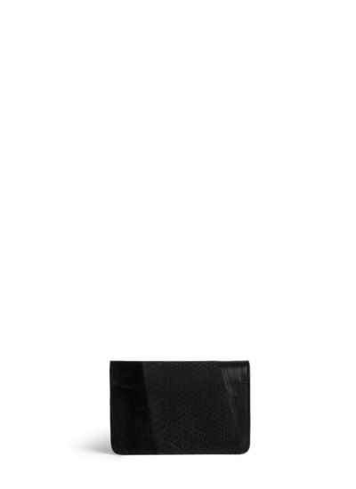 Dimensions optimales, fermeture par bouton pression, patchwork cuir python, lisse et suédé, deux fentes à cartes, fabrication italienne, composition 100 % cuir de vachette.