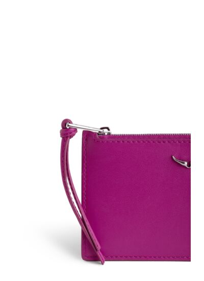 Fabriqué en cuir lisse, ce porte-monnaie se ferme par une fermeture zippée équipée d’une tirette en cuir. Il présente des ailes bombées pour un design unique et comprend une poche dos extérieure.