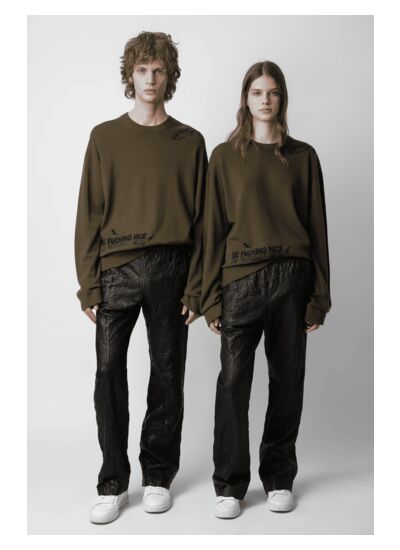 Ce pull en laine et cachemire se pare d’un kaki usé, sublimé par des motifs tags contrastés aux messages provocateurs « Be Fucking Nice » et « Kiss My Ass ». Son col rond et ses manches longues aux bords côtelés offrent une silhouette moderne, à la fois décontractée et structurée. Pensé pour tous, il fusionne subtilement les influences féminines et masculines, pour un look affirmé et sans compromis.