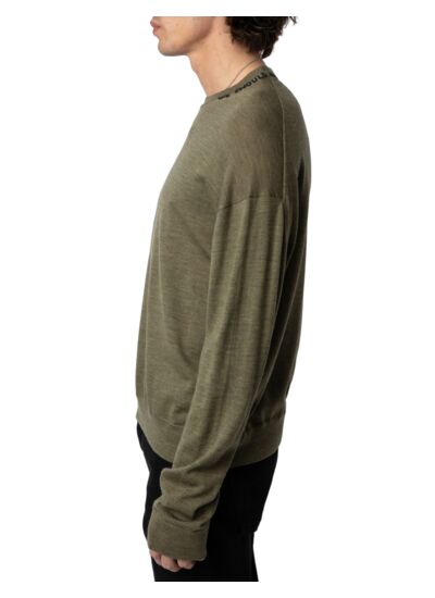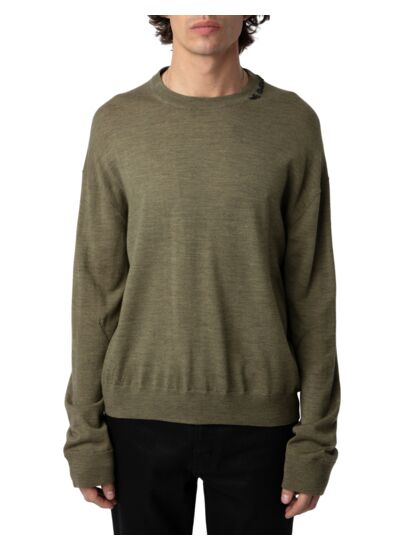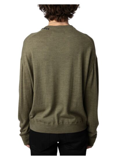 100 % laine mérinos fine, ce pull est signé Zadig&Voltaire. Il présente une coupe loose, un col rond avec broderie contrastée, des manches longues et des finitions côtelées aux poignets et à la base.