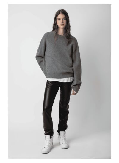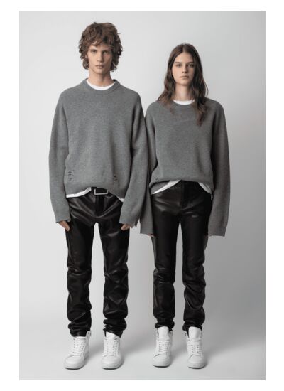 Pull en laine gris moyen unisexe, effet usé et signature ZV en pointelle. Col rond, manches longues, bords côtelés pour une tenue ajustée et confortable. Composition : laine. Marque : Zadig&Voltaire.