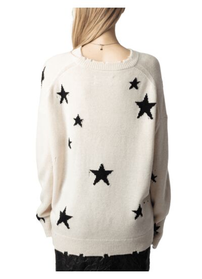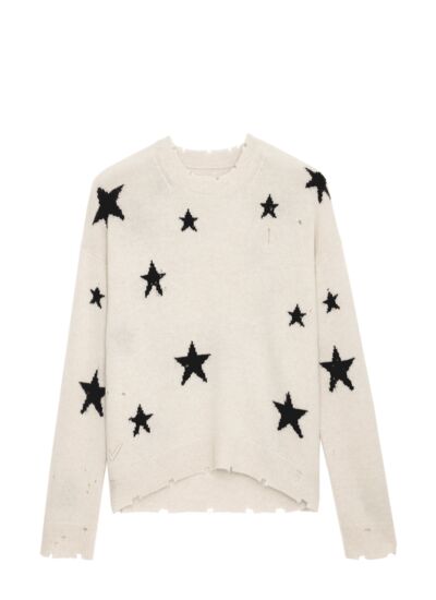 100% cachemire. Pull unisexe couleur Sugar écru. Motifs étoiles en jacquard intarsia. Détails destroy et signature ZV pointelle. Col rond, manches longues, bords côtelés. Marque : Zadig&Voltaire.