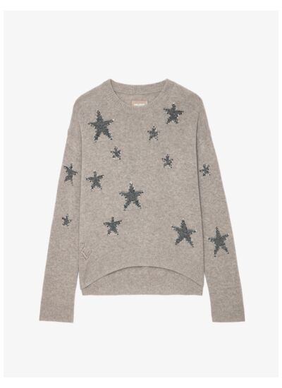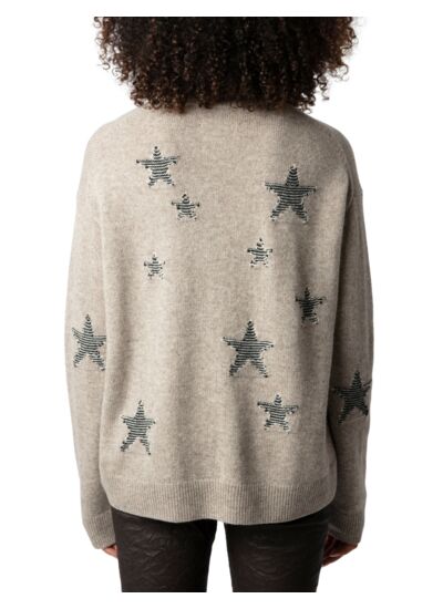 100 % cachemire, col rond, manches longues avec trous pour les pouces, bords côtelés, coupe courte à l’avant, motifs intarsia étoiles en tweed, signature ZV pointelle. Couleur marron Latte. Marque Zadig&Voltaire.