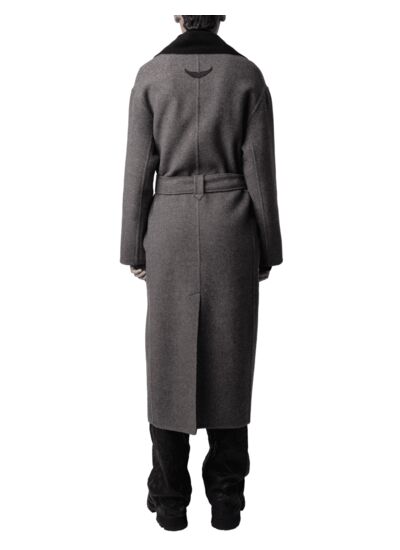 Manteau long en laine mélangée noire pour femme. Col en pique. Motif ailes contrasté au dos. Ceinture amovible. Plis au dos. Manches longues. Composition : laine. Marque : Zadig&Voltaire.