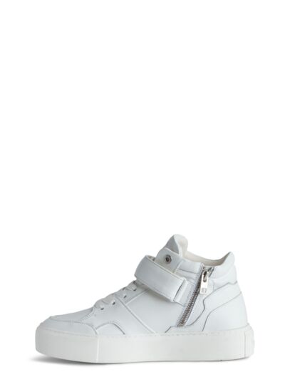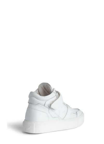Baskets mi-hautes en cuir lisse blanc pour femme, avec empiècements surpiqués. Fermeture mixte : lacets, zip et scratch. Semelle chunky compensée intérieure de 2,7 cm. Languette et semelle signées Zadig&Voltaire. Fabrication portugaise.