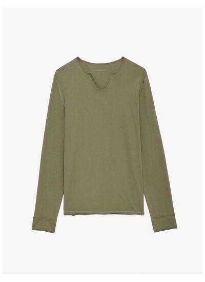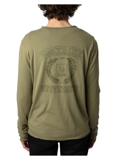 100% coton biologique. Col tunisien à 5 boutons. Manches longues avec bords bruts. Imprimé blason Zadig&Voltaire University au dos. Couleur kaki Seaweed. Marque : Zadig&Voltaire.
