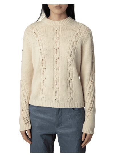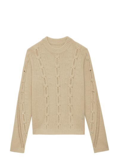 Fabriqué en laine mérinos de qualité, il présente un col rond classique, des manches longues et des finitions côtelées aux poignets et à la base. Les détails ajourés et torsades ajoutent du relief, tandis que les strass apportent une touche d’éclat subtile.