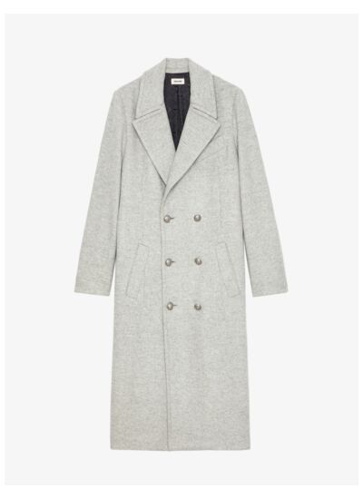Manteau long en laine mélangée gris, motif chevron. Col en pique, épaulettes, fermeture double boutonnage. Ceinture dos à nouer. Deux poches passepoilées latérales, une poche poitrine en biais. Manches longues avec poignets cassés. Composition : laine. Marque : Zadig&Voltaire.