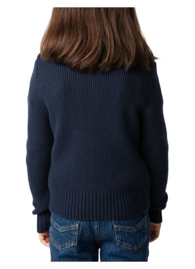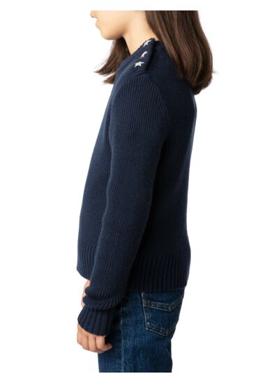100% laine. Pull en maille tricot côtelée fantaisie bleu marine pour fille. Col rond. Fermeture avec boutons étoiles sur l’épaule. Manches longues. Bords côtelés. Signature ZV pointelle. Marque Zadig&Voltaire.