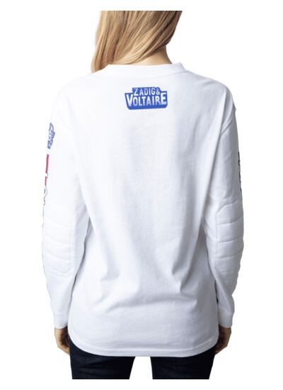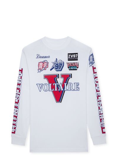 Composition : 100% coton. Col rond. Manches longues avec coudes rembourrés. Motifs badges Voltaire. Coupe unisexe. Couleur : blanc. Marque : Zadig&Voltaire.